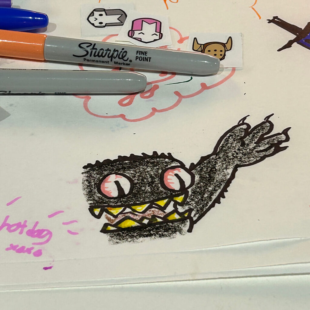 Smirky also returned to our booth this year to share Painter Boss Paradise with his community! | Hollymcfolly dodged many cantaloupes and red eggshells playing BEHEMOTH, ending with a high score of 3,635 babies saved. |